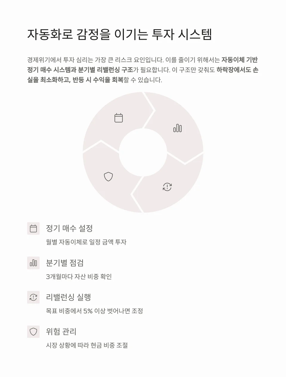 자동이체 기반 정기 매수 시스템과 분기별 리밸런싱 구조가 필요합니다.