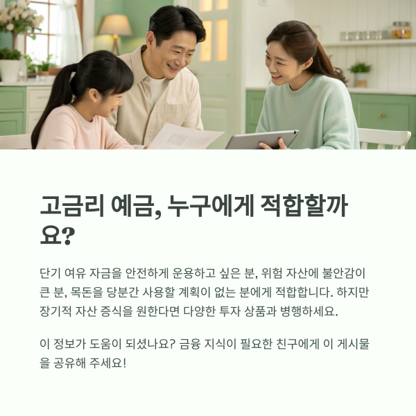 하지만 장기적인 자산 증식을 원한다면 예금 외 상품과 병행 전략이 필요합니다.