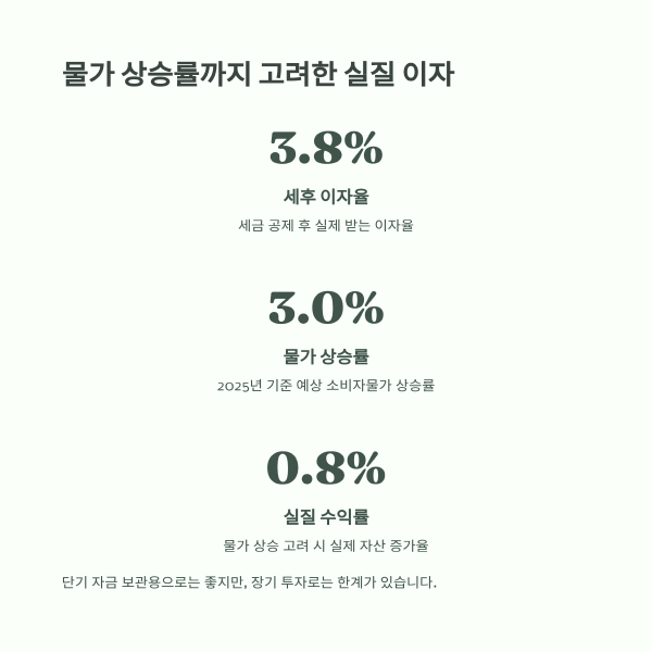 세후 이자 3.8% 예금의 실질 수익률은 약 0.8% 수준이 됩니다.
