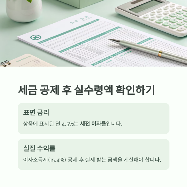 예금 상품에 표시된 연 4.5% 금리는 세전 이자율(세금을 떼기 전)입니다.