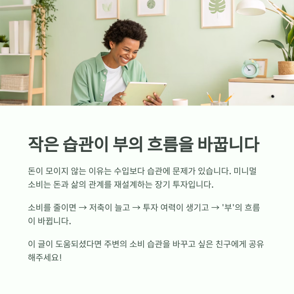 미니멀 소비는 이렇게 ‘나도 모르게 나가는 돈’을 줄이고, 자산 축적의 출발점을 만들어줍니다.