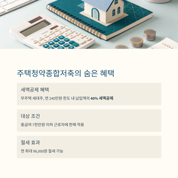 주택청약종합저축은 청약 기능과 세제 혜택을 동시에 갖춘 상품입니다.