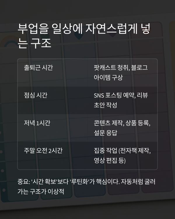 핵심: 부업은 ‘틈새 시간에 몰입하는 구조’가 되어야 무너지지 않는다