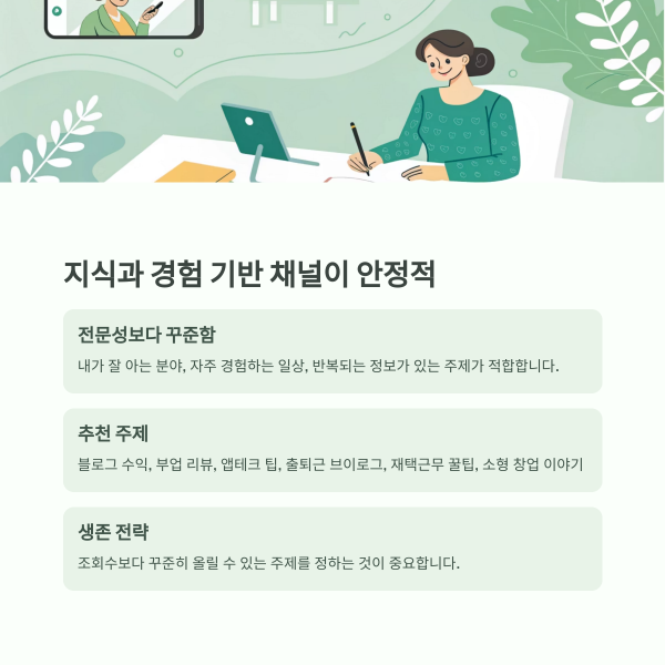 처음부터 ‘조회수’보다 ‘꾸준히 올릴 수 있는 주제’를 정하는 것이 생존 전략입니다.