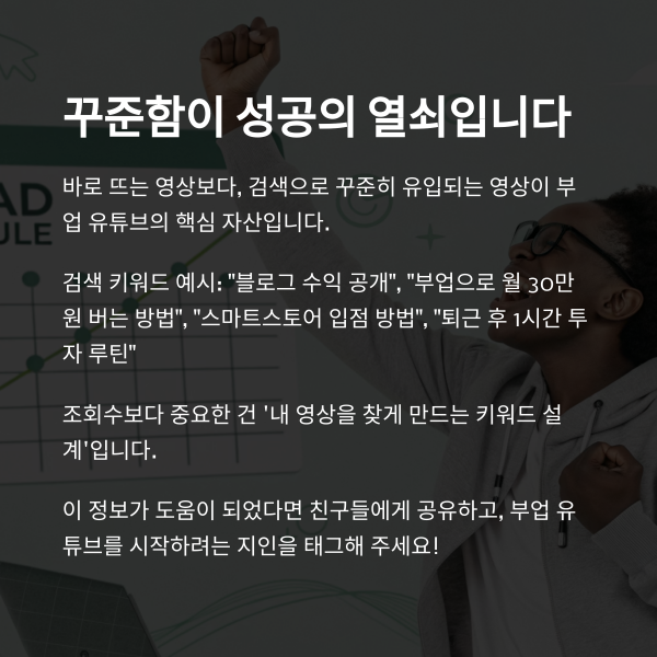 바로 뜨는 영상보다, 검색으로 꾸준히 유입되는 영상이 부업 유튜브의 핵심 자산입니다.