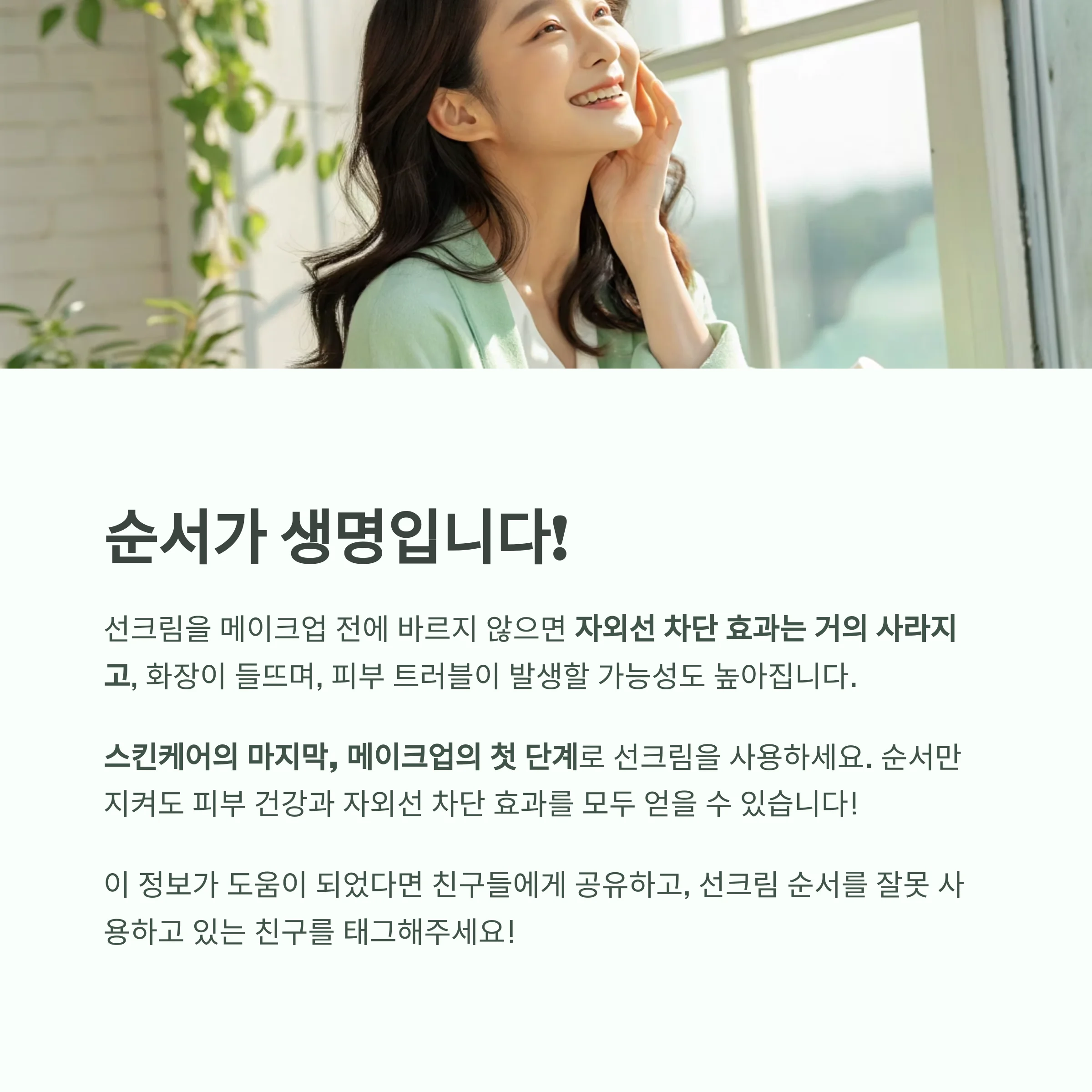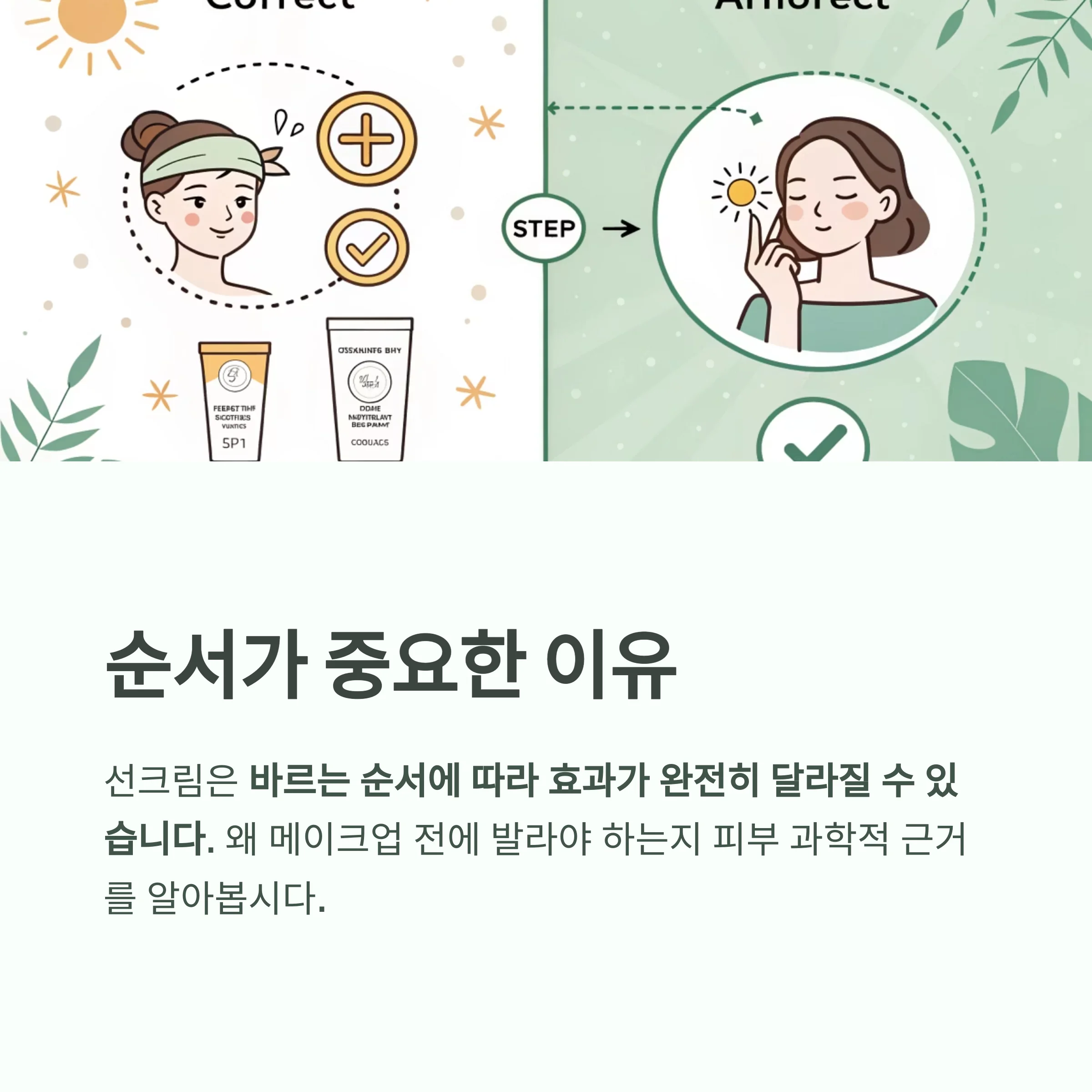 순서를 지키는 것만으로도 피부 건강과 자외선 차단 효과 모두를 잡을 수 있습니다.