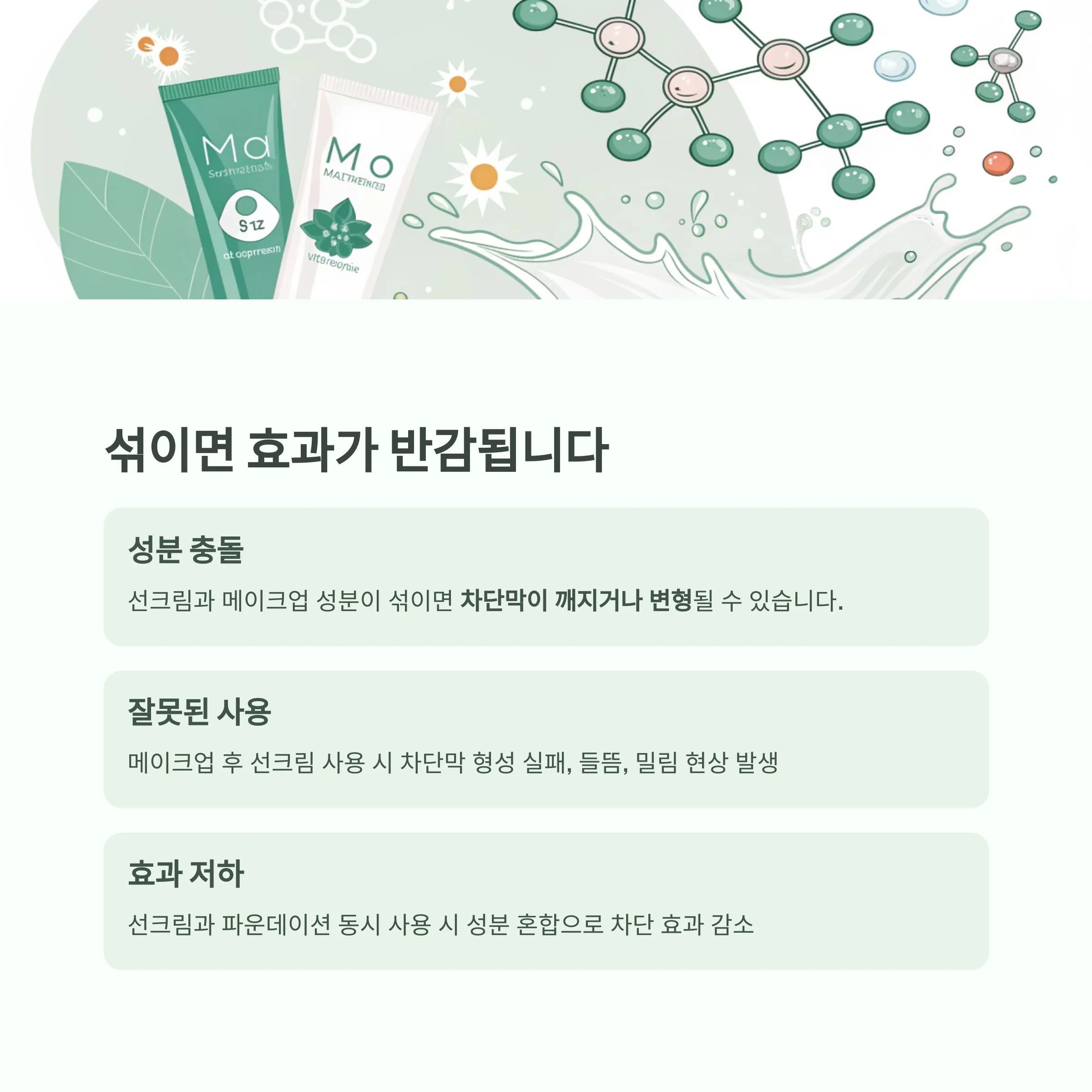 | 메이크업 후 선크림 | 차단막 형성 실패, 들뜸, 밀림 |