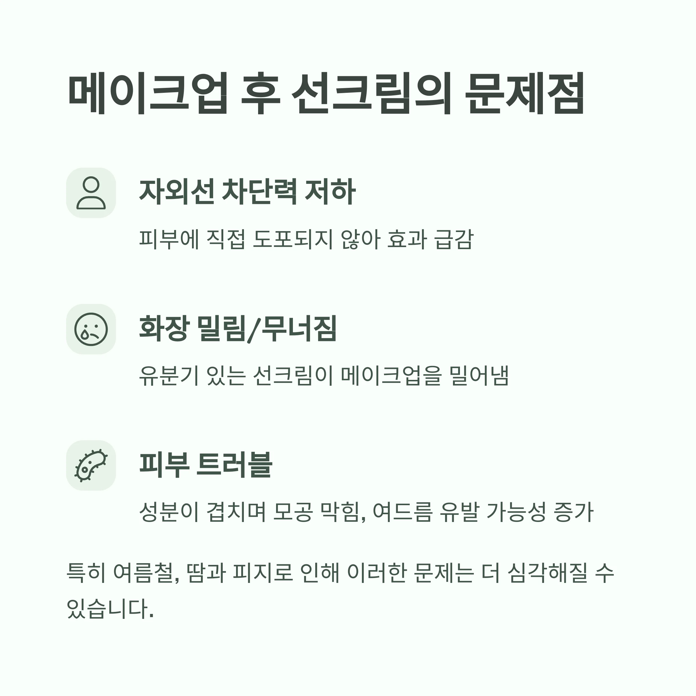 - 화장 밀림/무너짐: 유분기 있는 선크림이 메이크업을 밀어냄