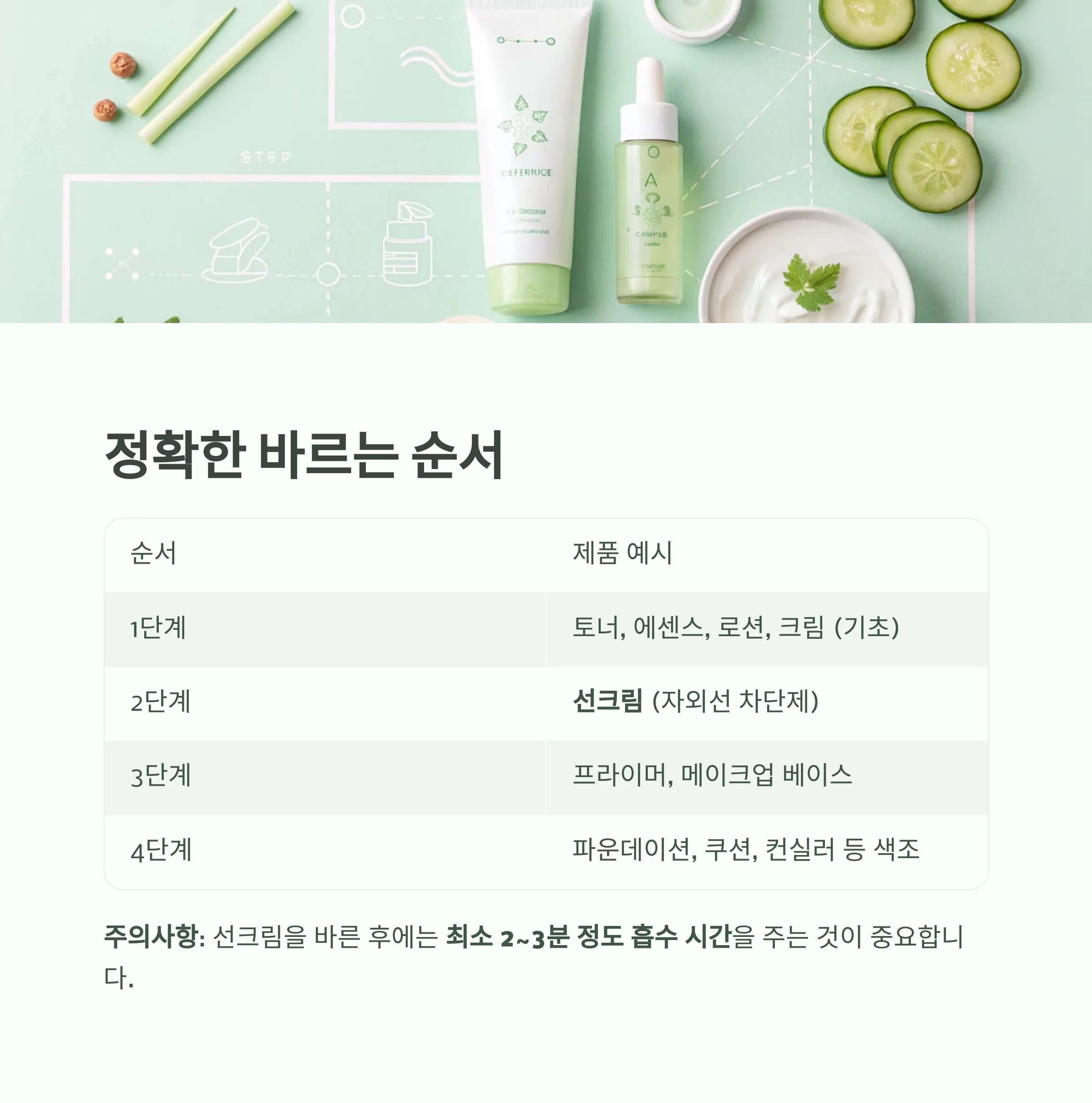 주의사항: 선크림을 바른 후에는 최소 2~3분 정도 흡수 시간을 주는 것이 중요합니다.