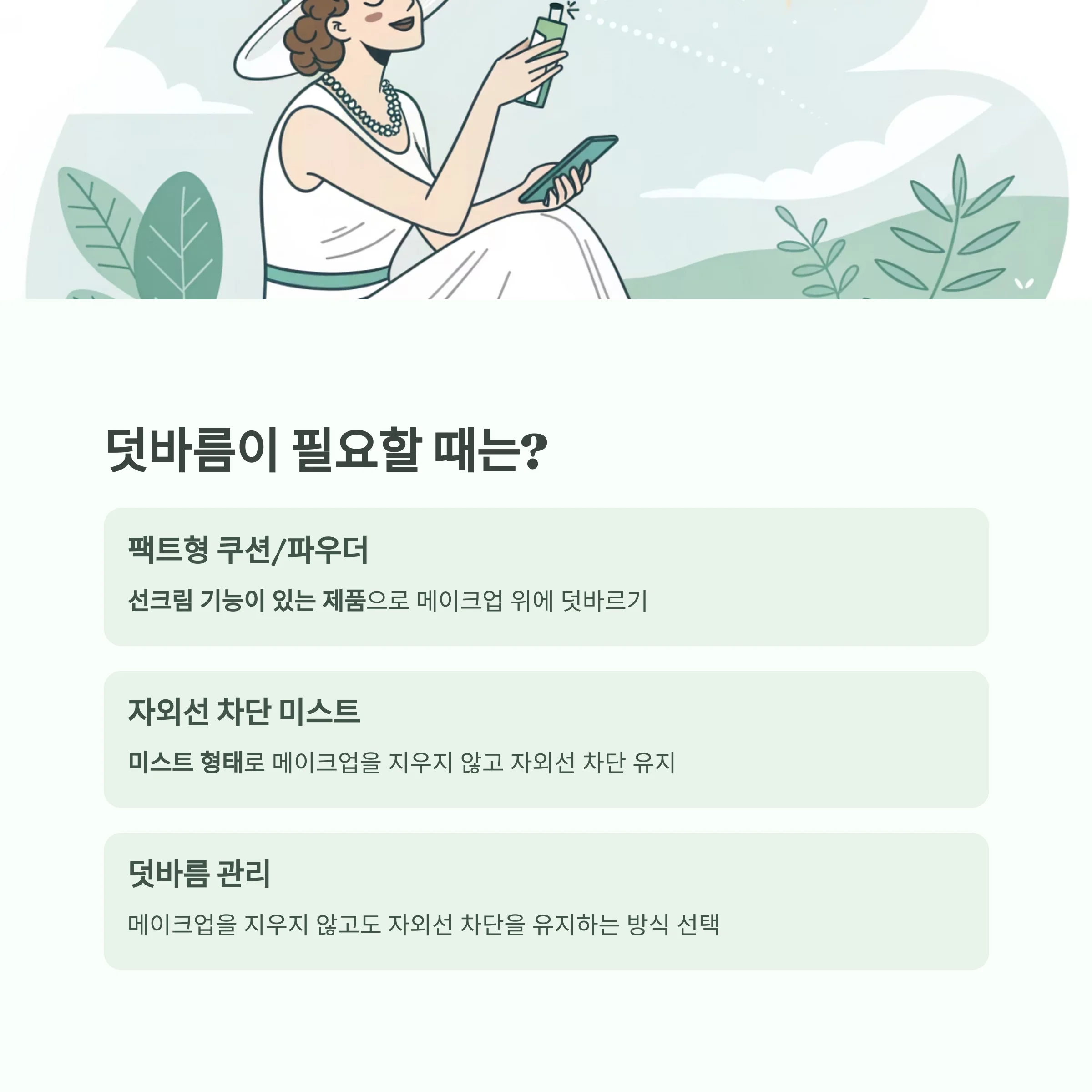 "메이크업을 지우지 않고도 자외선 차단을 유지할 수 있는 방식으로 덧바름을 관리해야 합니다."