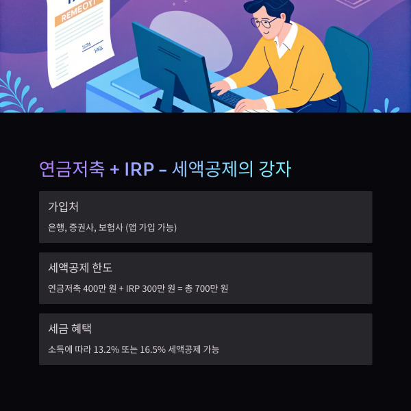 | 연금저축계좌 + IRP | 연 최대 700만 원 납입 시 세액공제 최대 115만 원 | 소득 있는 근로자, 자영업자 |