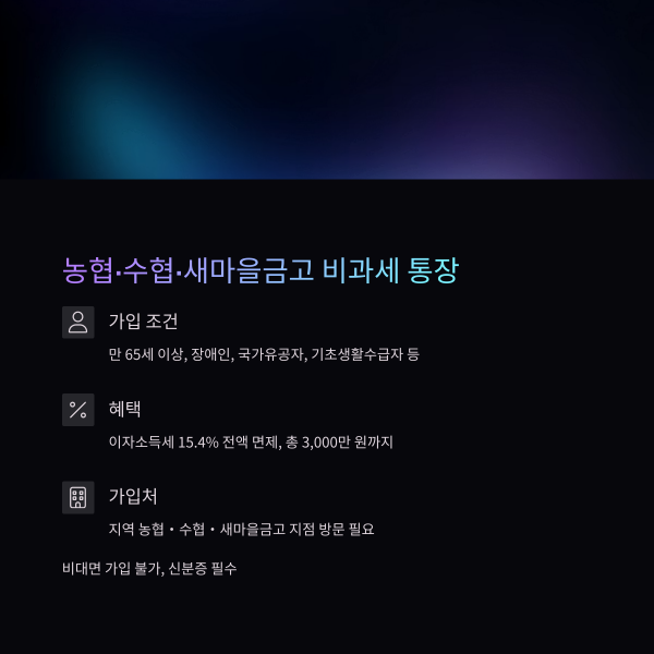 | 농협/수협/새마을금고 비과세 상품 | 이자소득세 전액 비과세 (1인당 3,000만 원 한도) | 만 65세 이상, 장애인, 기초생활수급자 등 |