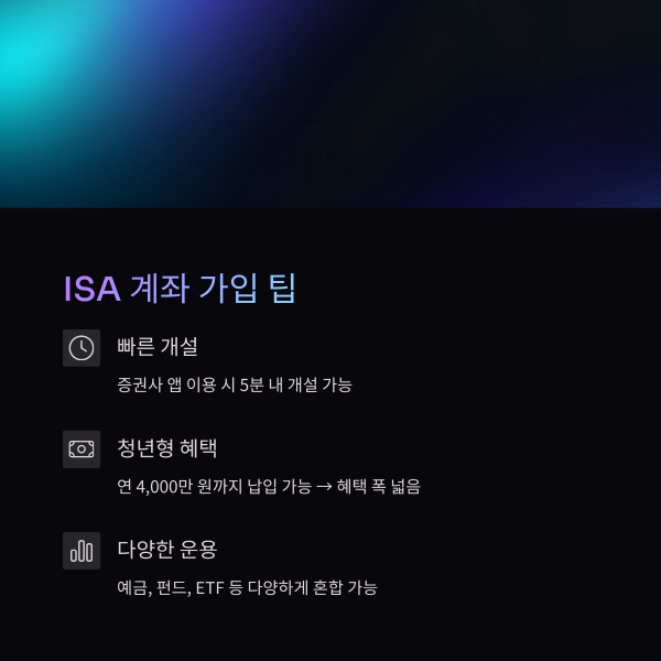 | ISA (개인종합자산관리계좌) | 수익 중 200~400만 원까지 비과세 | 만 19세 이상, 거주자 누구나 |