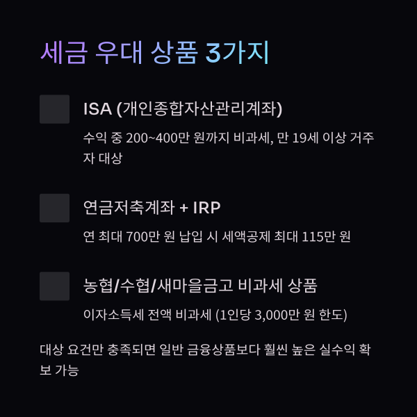 세금 혜택이 붙은 금융상품은 같은 이자라도 더 많은 실수익을 만들 수 있습니다.