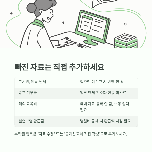 누락된 항목은 ‘연말정산 간소화 자료 수정’ 또는 ‘공제신고서 직접 작성’을 통해 추가 제출해야 합니다.