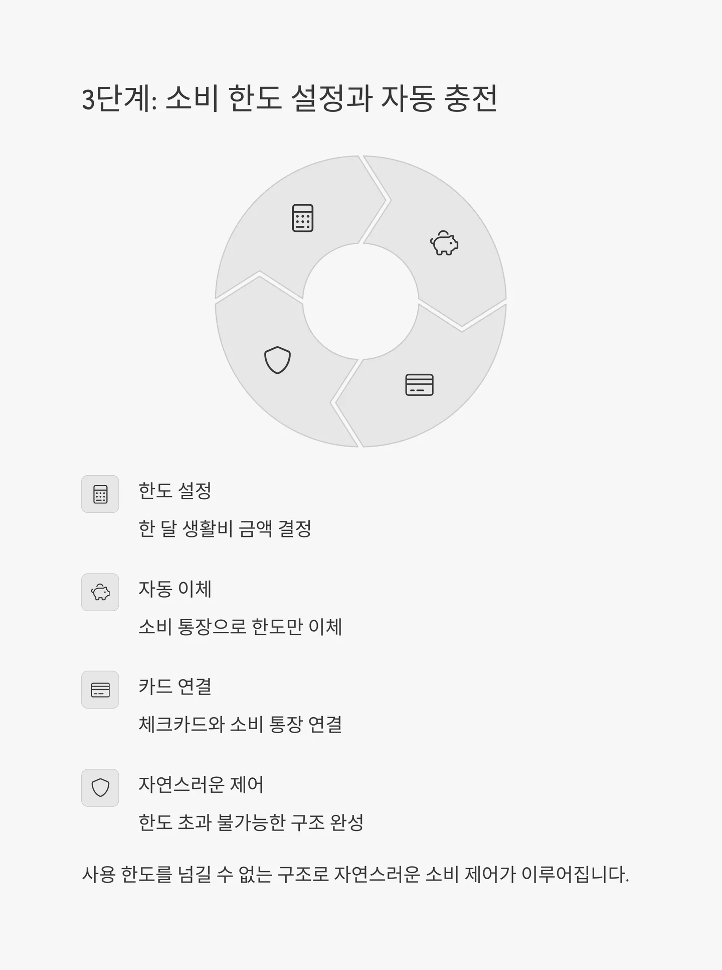 | 소비통제 | 소비 통장 | 식비, 교통비, 여가비 등 | 사용 한도만 이체 |