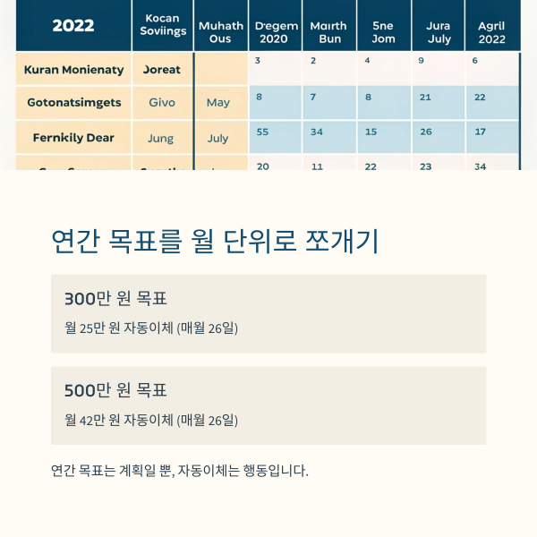 월별 목표로 쪼개고 자동이체를 걸면 현실적인 실행이 가능해집니다.