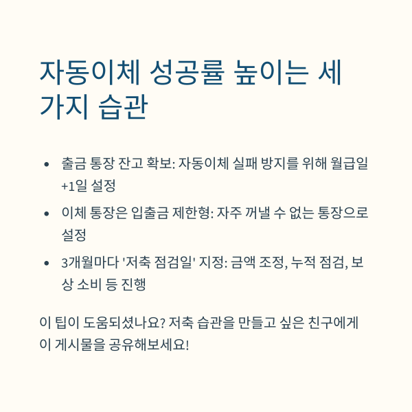핵심은 단순합니다. 돈을 쓰기 전에 먼저 저축하는 자동이체 시스템을 만드는 것이죠.