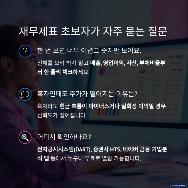 A. 전체를 보려 하지 말고 매출, 영업이익, 자산, 부채비율부터 한 줄씩 체크하세요.