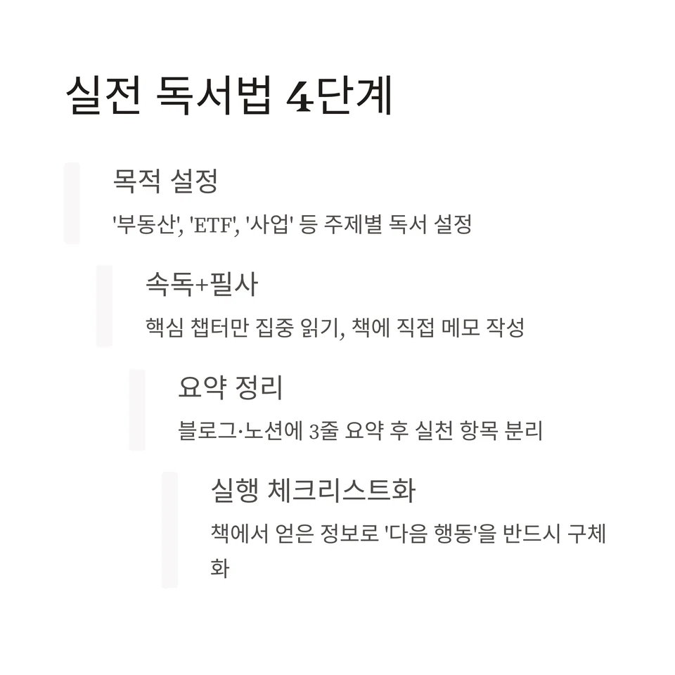 핵심: 읽은 내용을 정리하는 것이 아니라 ‘행동 항목’으로 바꾸는 것이 진짜 독서