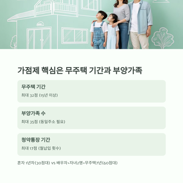 가점제 청약에서는 무주택 기간, 부양가족 수, 청약통장 가입 기간이 점수를 결정합니다.