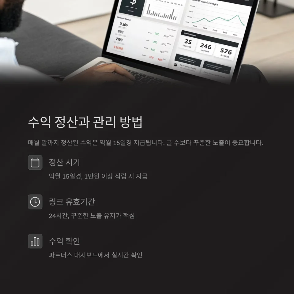 - 수익 확인: 파트너스 대시보드에서 실시간 가능