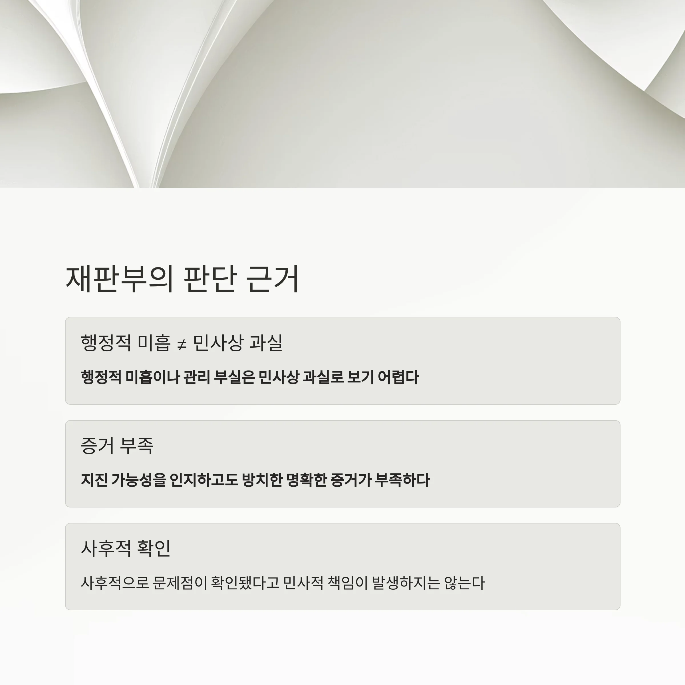 즉, 사후적으로 문제점이 확인됐다고 해서 민사적 책임까지 발생하지는 않는다는 취지입니다.