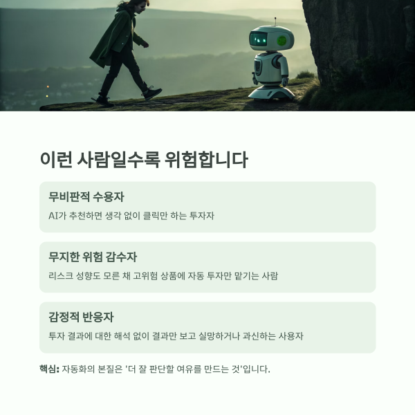 - 리스크 성향도 모른 채 고위험 상품에 자동 투자만 맡기는 사람