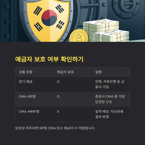 MMF형, 종금형 등 일부 CMA는 예금자 보호 대상이 아닐 수 있으므로 유형 확인이 필요합니다.
