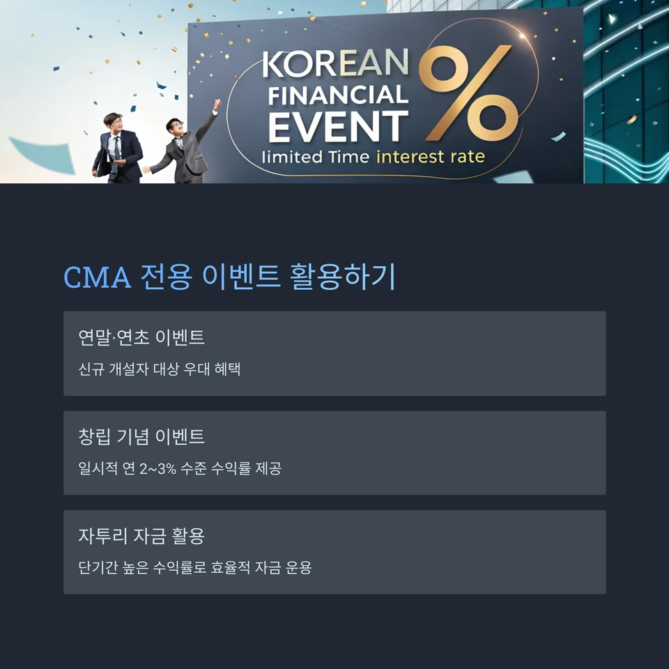 특정 기간에 신규 개설자 대상으로 CMA 우대 이벤트가 자주 진행됩니다.