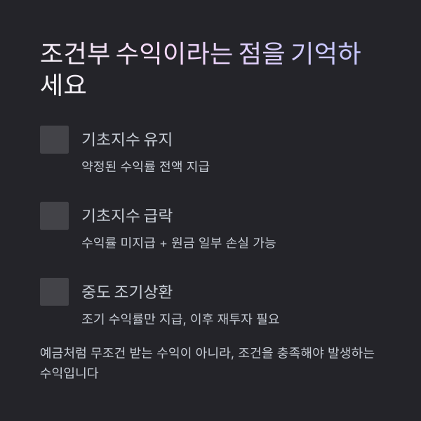중요: 예금처럼 ‘무조건 받는 수익’이 아니라, ‘조건을 충족해야 발생하는 수익’