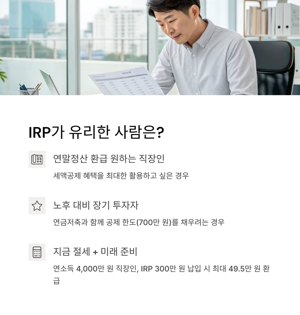 중요: IRP는 ‘지금 절세’ + ‘미래 노후 자금’이라는 이중 효과가 있는 구조